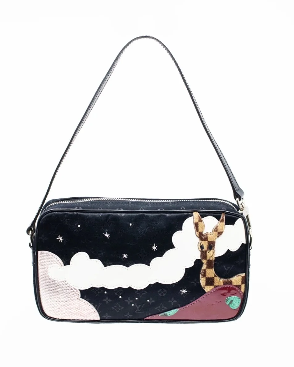 To accompany Louis Vuitton's Summer ‘02 collection, Marc Jacobs called on British illustrator, Julie Verhoeven, to collaborate on a series of whimsical handbags. Created in patchworks of satin, leather and suede, the small silhouette is designed with a dream-like landscape of LV logo skies, billowy clouds and a heritage-checked giraffe. The interior is perfectly-sized to fit your phone, cards and a lipstick.